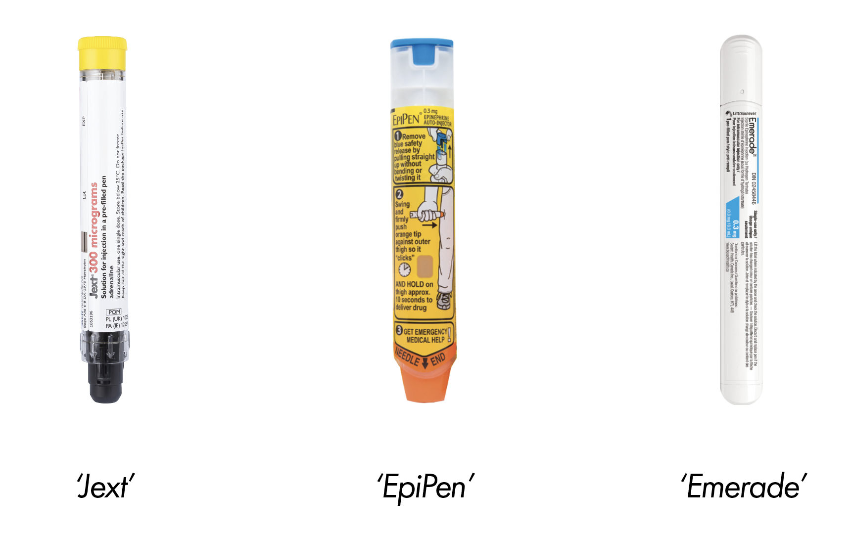 In the UK there are three different brands of adrenaline pens which are equally prescribed to individuals with severe allergies (anaphylaxis): EpiPen, Jext, and Emerade.