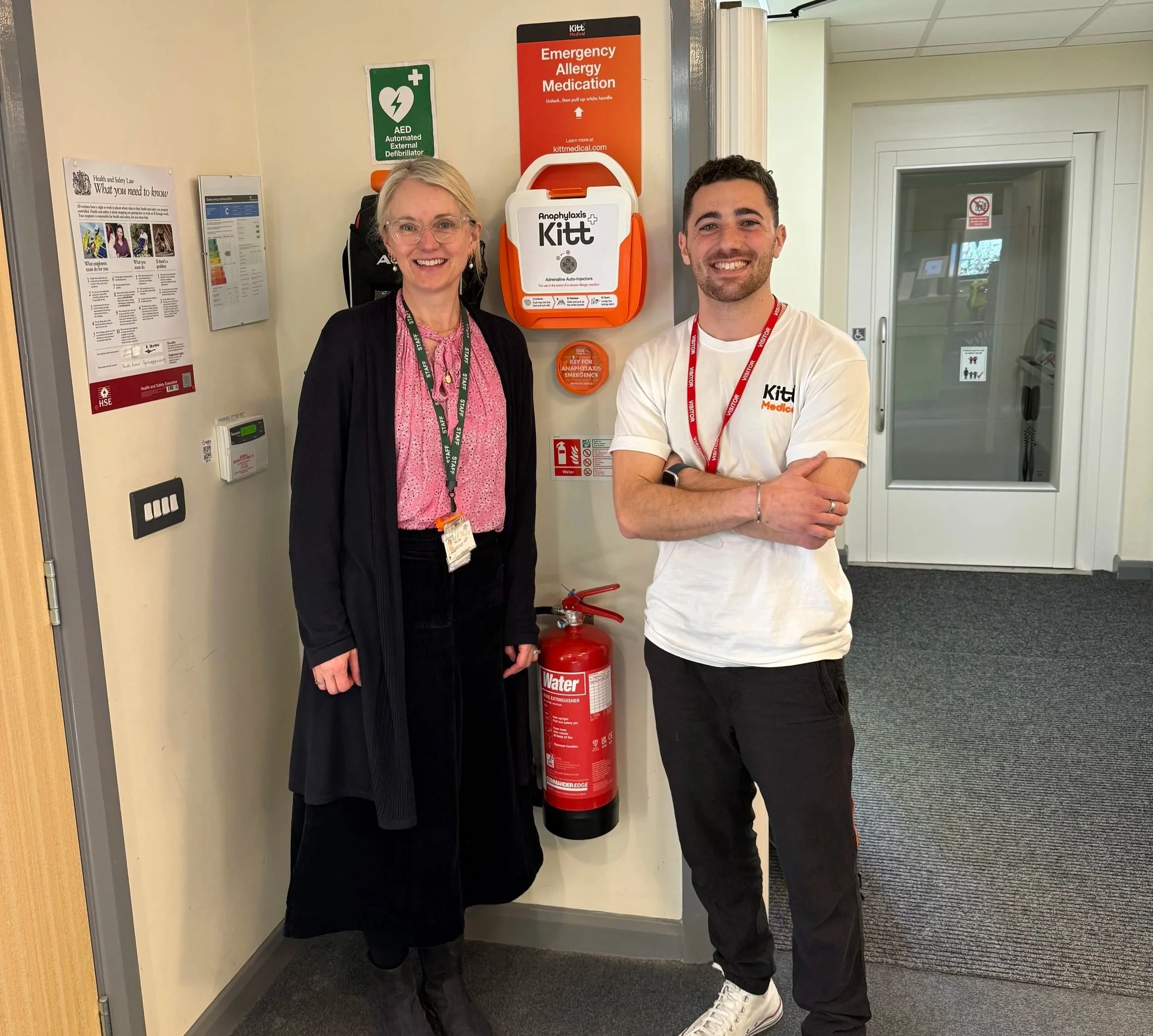 Caroline Bell, the office manager at Lime Tree Primary who used the Anaphylaxis Kitt without hesitation - stood with Kitt Medical’s co-founder Zak Marks in the school reception.