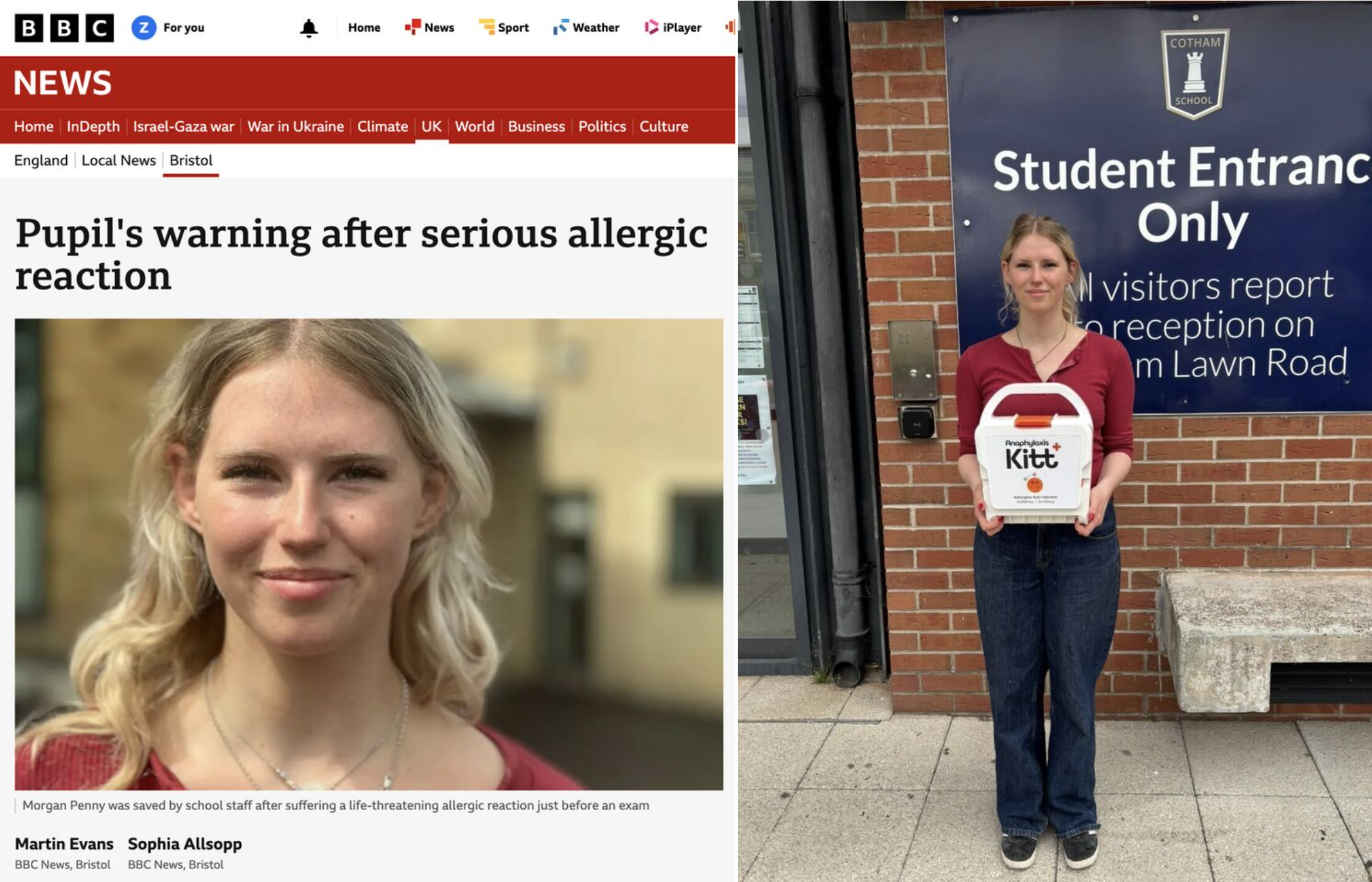 A hidden Brazil nut in a snack bar with a ‘may-contain’ label nearly cost 18-year-old Morgan Penny her life just before her exams - until staff at her school in Bristol used an adrenaline pen from a Kitt Medical emergency Anaphylaxis Kitt to save her.